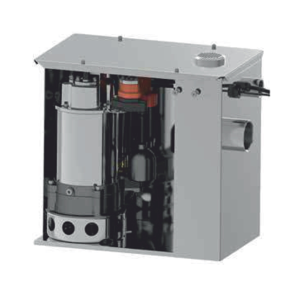 Установки состоят из сборного бака из нержавеющей стали с резьбовыми патрубками, автоматического погружного насоса (опция), оборудованного выпускным трубопроводом, обратного клапана и звуковой сигнализации высокого уровня. В комплект поставки установки ходят пластиковые присоединительные фитинги с трубной резьбой.