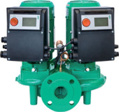 Сдвоенный насос Wilo-VeroTwin-DP-E с сухим ротором линейного типа для установки в трубах или на фундаменте со встроенным частотным преобразователем для электронного регулирования параметров, в том числе постоянного или переменного перепада давления (dp-c/dp-v). Мотор трехфазного тока с классом эффективности IE2. Всасывающий и напорный патрубки одинакового диаметра расположены на одной оси.
